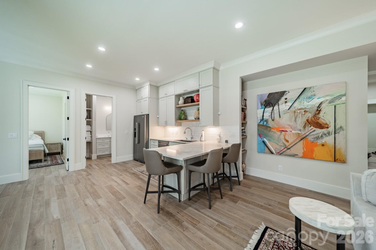 Beautiful newer construction in Providence Park on a private .6-acre lot. This charming cottage–style home offers 3 levels of living space, 6 BR/6 BA, covered front and back porches, and 2 attached garages (2- car and a separate 1-car). Flooded with natural light, the open-concept interior features high ceilings (10' on the main and lower level) and 9’ ceilings upstairs. The gourmet kitchen offers SS appliances, quartzite countertops, a large island and walk-in pantry - opening seamlessly to the vaulted great room which flows into the dining area, and outdoor living space. The main-level primary suite is a true retreat, with vaulted ceiling and luxury en suite bathroom featuring a soaking tub, separate shower, dual vanities, and walk-in closet. Upstairs features 2 bedrooms, full bath, bonus room, and a second laundry room. The lower level suite is thoughtfully designed for entertaining, wellness days or extended stays, featuring a family room with fireplace, kitchenette, wine cellar, exercise room, and a private spa experience with sauna and oversized walk-in shower,. Two additional bedrooms and ample storage complete this level. Outdoors, the fenced and landscaped backyard provides privacy and tranquility, enhanced with full irrigation and a whole-house generator - an exceptional finishing touch to this quiet setting convenient to Cotswold, Uptown and SouthPark.