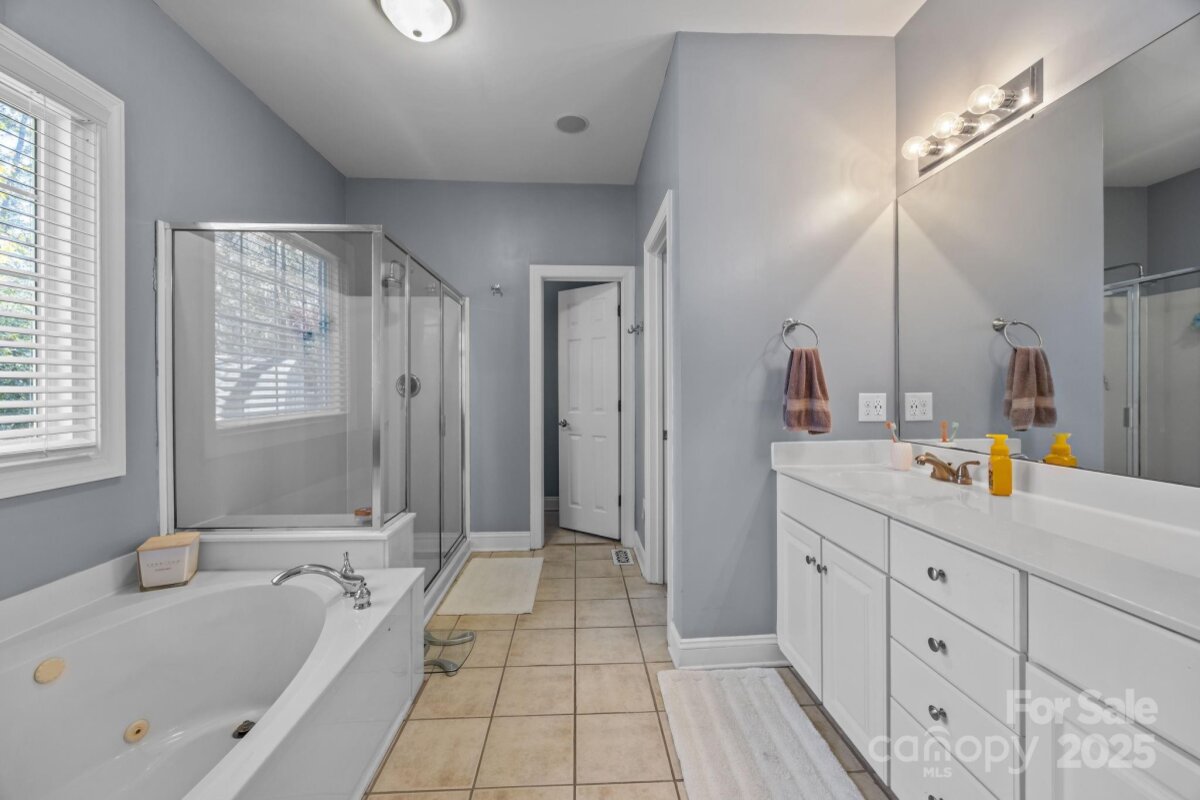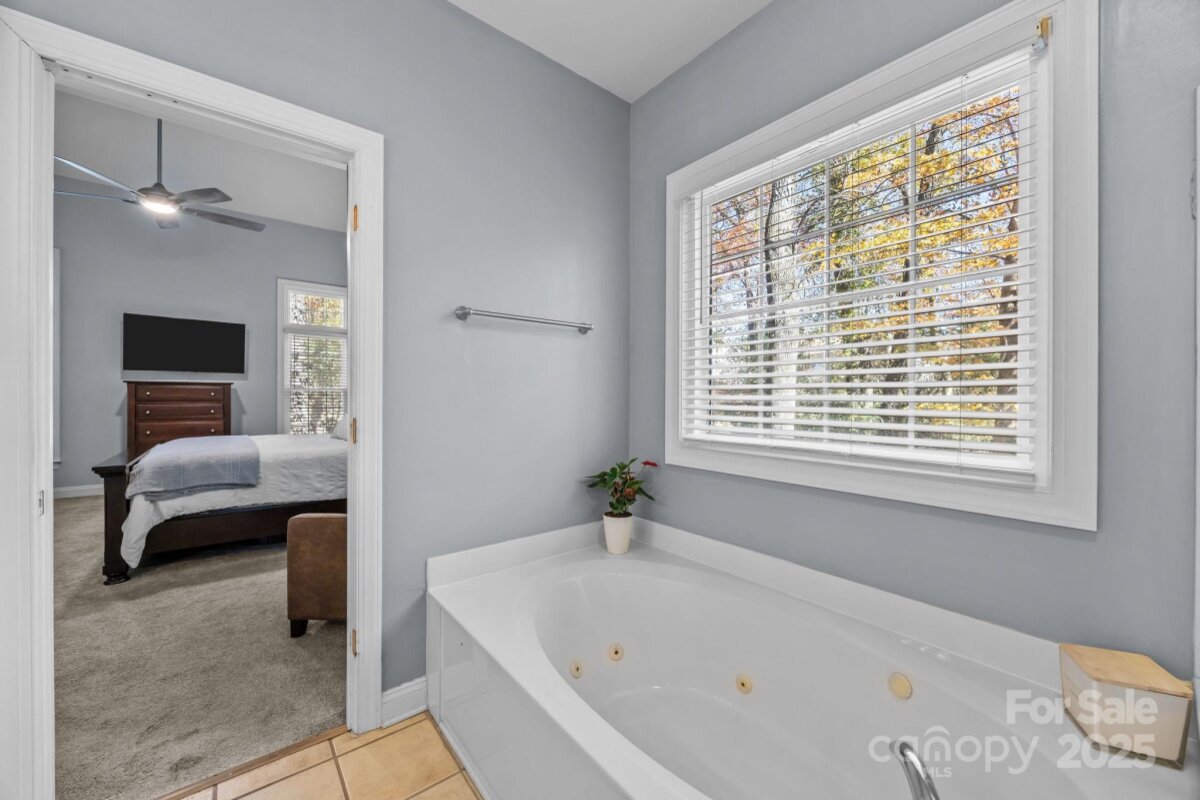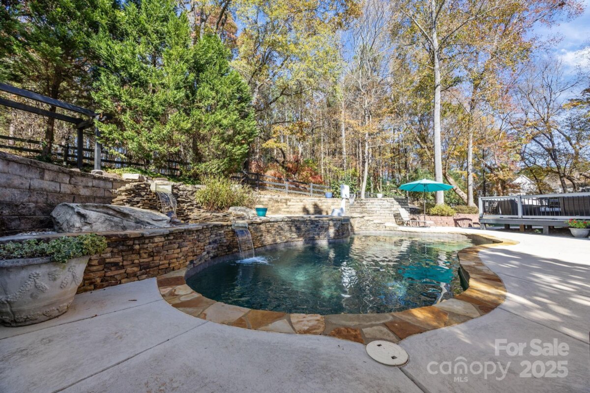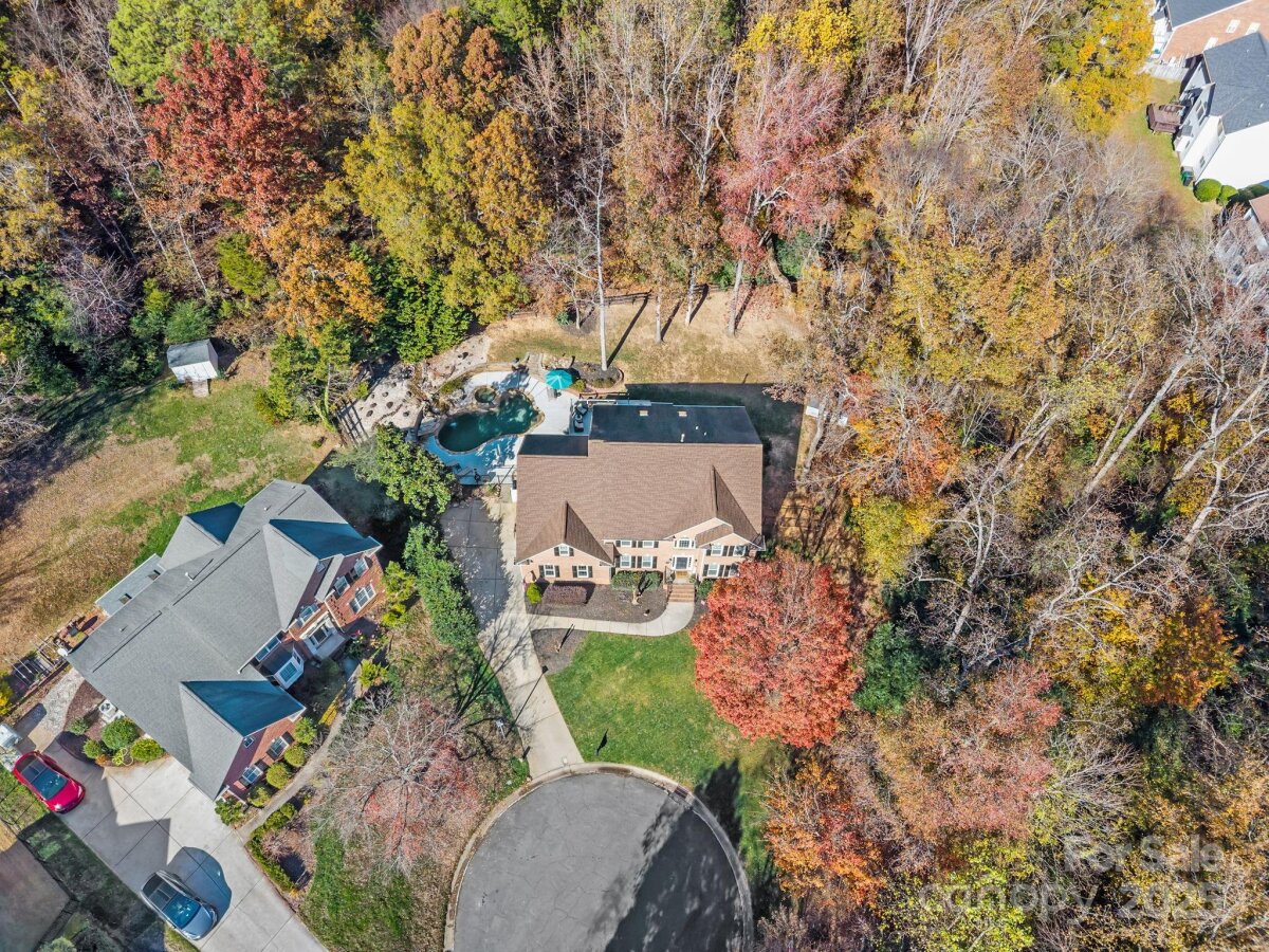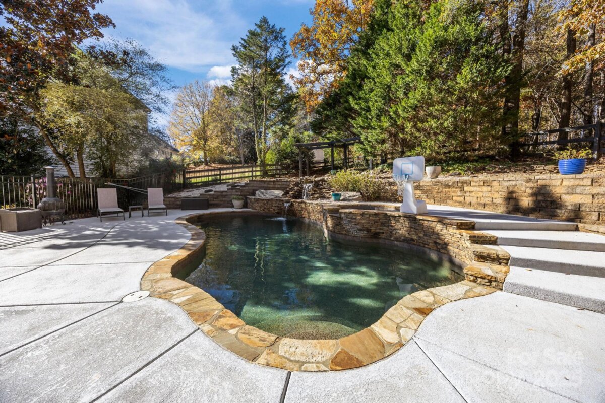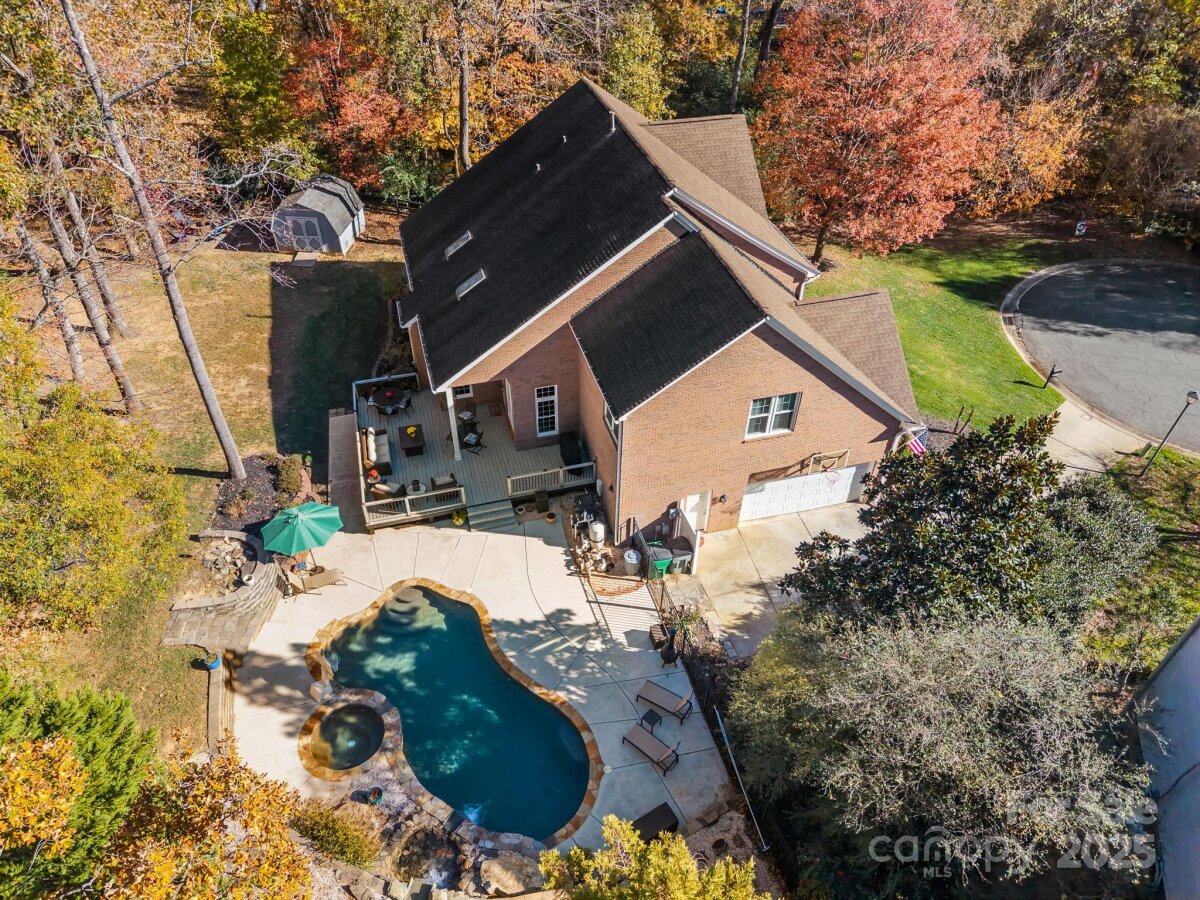 Stunning all-brick, five-bedroom home located on an oversized cul-de-sac lot in the highly desirable Ballantyne area. This prime location offers convenient access to shops, restaurants, and I-485. This spacious home features an open floor plan with elegant hardwood floors throughout the main living areas, including a dramatic two-story great room with abundant natural light from its skylights. The main-level primary ensuite offers a luxurious retreat with a jetted tub. A versatile fifth bedroom, which can also serve as a bonus room, boasts a large closet, flexible usage options, and a private staircase leading up from the main level. Outdoor living and entertaining are made easy with a beautiful pebble-tec in-ground pool and hot tub, complete with a soothing waterfall feature, alongside a spacious deck. The mature landscaping provides exceptional privacy and charm, enhancing this outdoor oasis. Additional highlights include a covered porch, an oversized garage with built-in shelving, a dedicated storage outbuilding, and a gas line ready for stove conversion. With a low HOA and exceptional curb appeal, the meticulously maintained yard and inviting exterior truly make this home a standout.