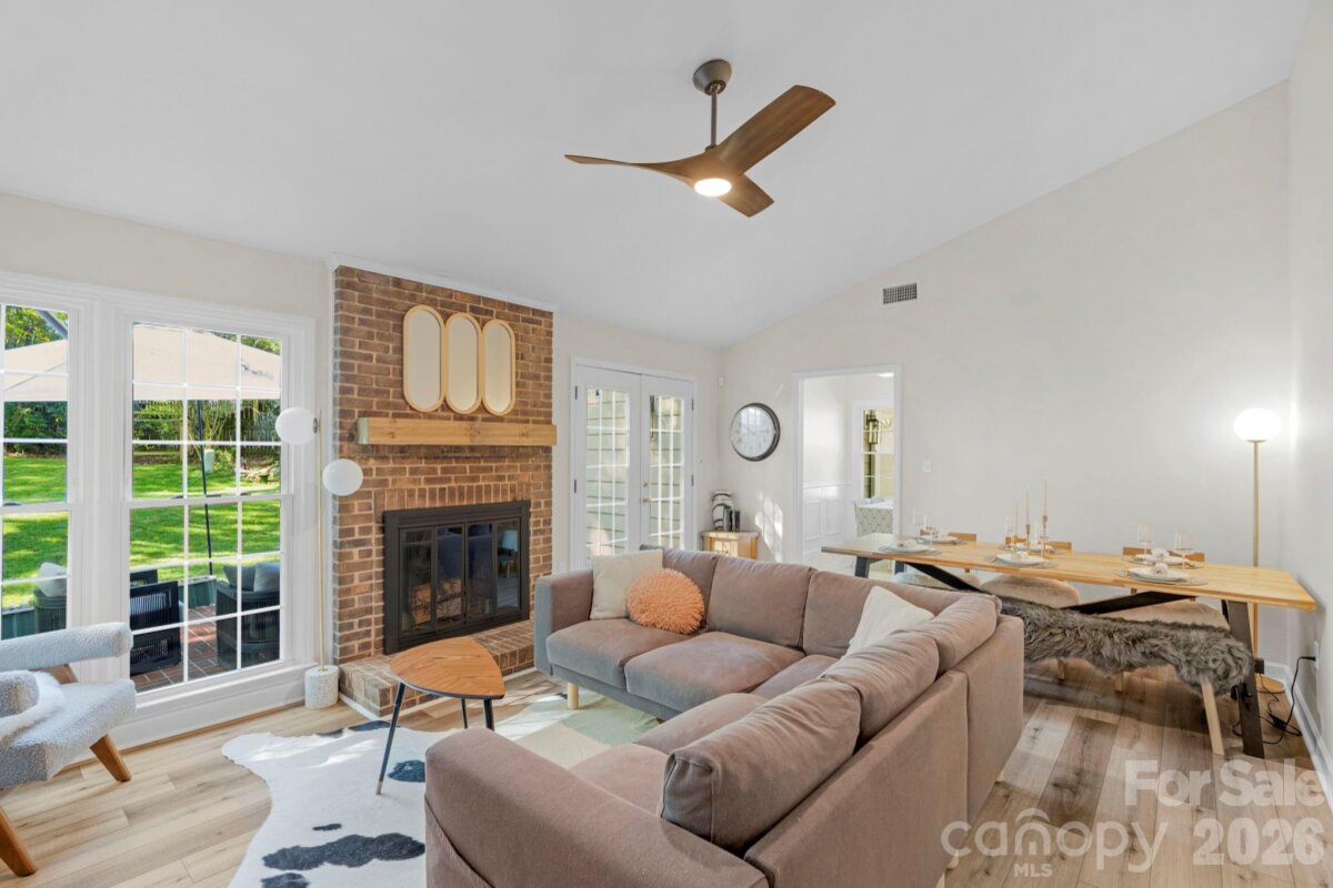 Nestled on a picturesque, tree-lined lot, this classic ranch home offers a warm and inviting atmosphere with a layout designed for comfortable, everyday living. Step inside to a welcoming foyer that opens into a bright and airy living space, highlighted by oversized windows and a stylish barn door leading to a versatile office or guest area. The family room features a vaulted ceiling and cozy fireplace, seamlessly connecting to the kitchen and dining area while maintaining distinct spaces for gathering and entertaining. Luxury vinyl plank (LVP) flooring runs throughout the main living areas, complemented by wooden blinds, updated lighting, and new switches and outlets for a clean, modern touch. The thoughtfully designed bedroom layout ensures privacy, including a spacious primary suite with its own bath, along with two additional carpeted bedrooms for added comfort. Step outside to enjoy an oversized patio overlooking a fully fenced backyard, both private and generously sized, perfect for relaxing or entertaining. Major updates provide peace of mind, including a new roof, gutters, and downspouts (2024), HVAC system (2024), updated fuse box, and a new dishwasher (2025). An oversized two-car attached garage adds everyday convenience, and features additional attic storage above garage with pull- down access. Residents will also enjoy fantastic neighborhood amenities such as a pool, sports courts, playgrounds, and an athletic field—all just minutes from shopping and dining. This well-maintained home is move-in ready and waiting for you—don’t miss your chance to make it yours!