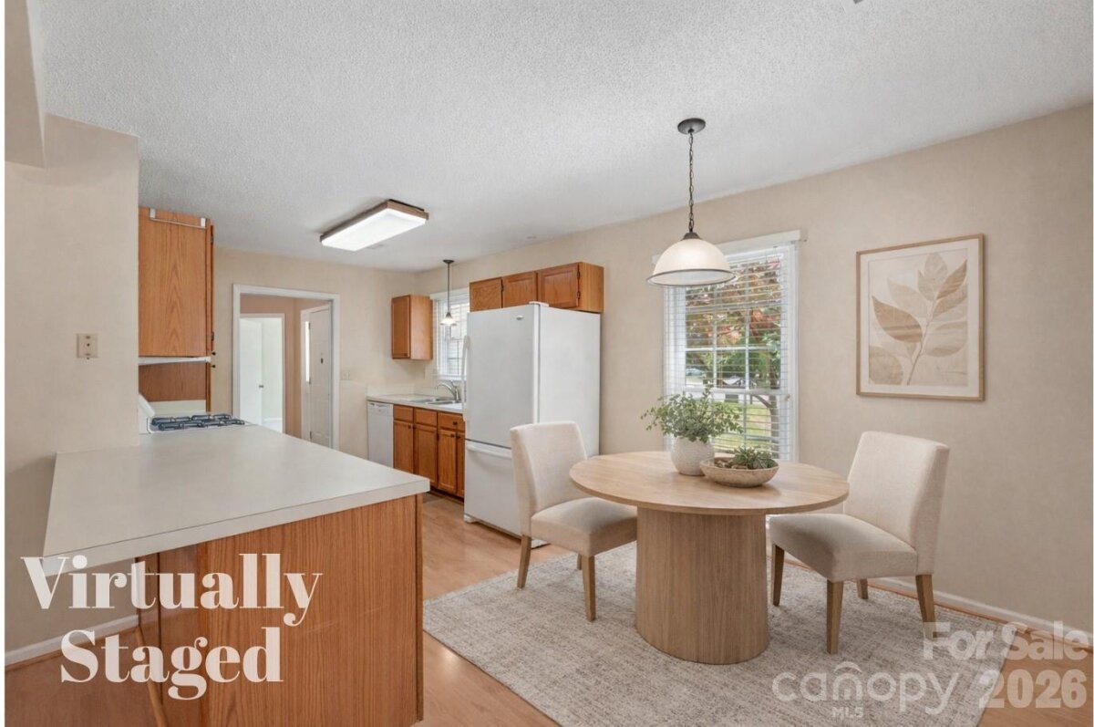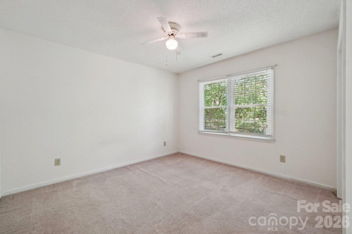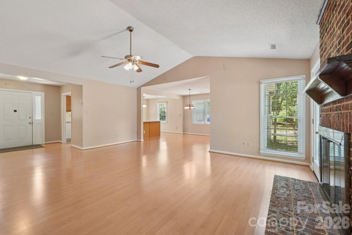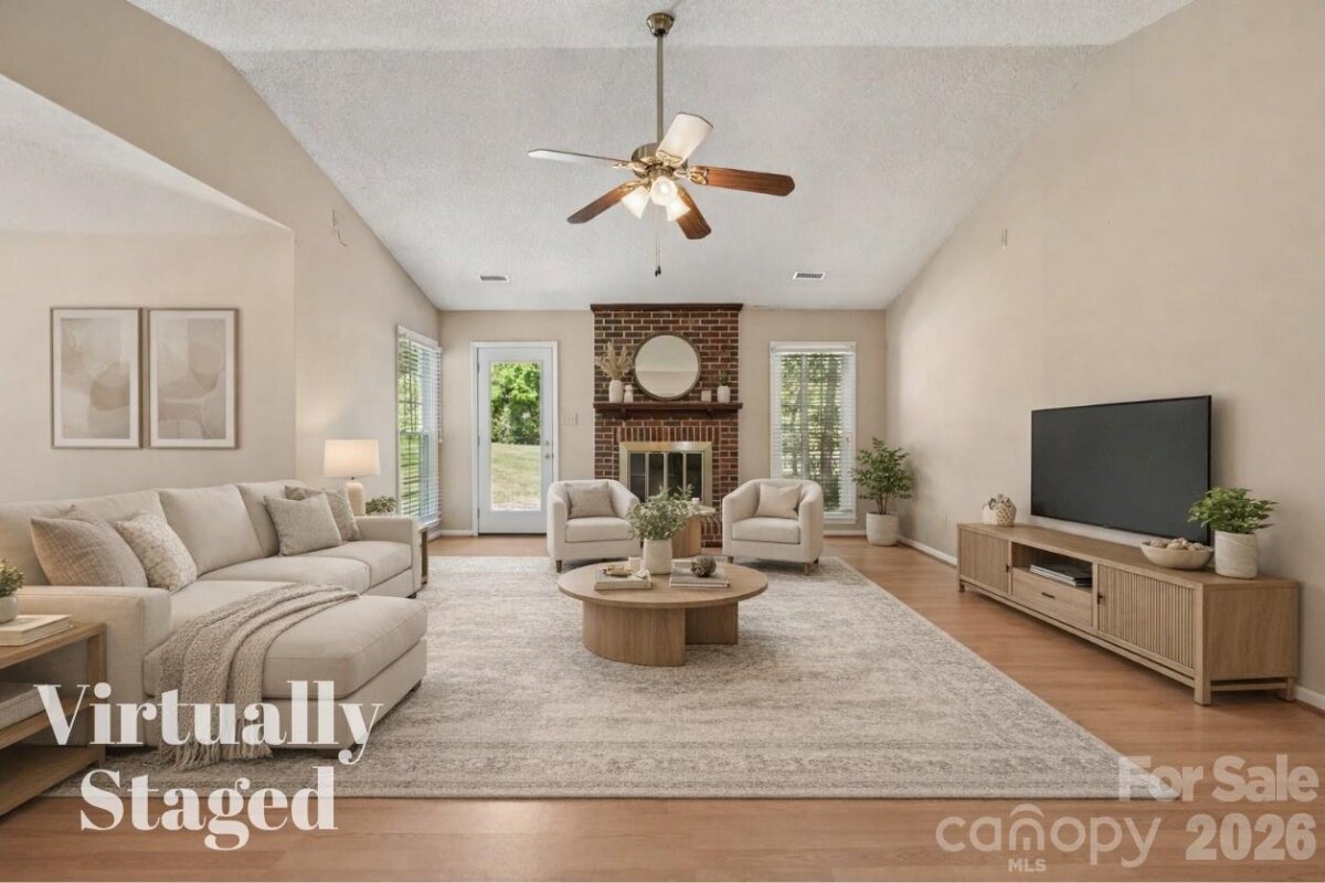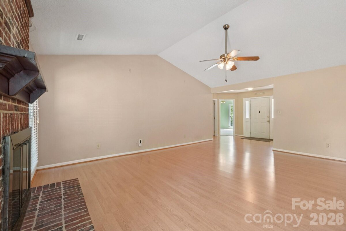 Tucked away on a quiet cul-de-sac in the desirable Raeburn community, this single-level ranch sits on a beautiful, level lot of approximately half an acre and offers a comfortable, functional layout with four bedrooms and inviting living spaces. A massive backyard - partially fenced - provides plenty of room to relax, garden, or entertain, and is complemented by both an outdoor storage shed and attached storage for added convenience. Inside, the home is designed for easy everyday living. The vaulted ceiling in the great room creates an airy feel, while a classic brick wood-burning fireplace with a wood mantle serves as a warm focal point. From here, a door leads directly to the patio, extending your living space outdoors. The eat-in kitchen features laminate countertops, a gas range, built-in microwave, and dishwasher, and flows seamlessly into a cozy breakfast nook as well as a separate dining area that can easily accommodate traditional or bench-style seating. A bright front bedroom with large windows and a ceiling fan offers flexibility as a guest room or home office. All bedrooms include ceiling fans for added comfort. A full hall bath serves the secondary bedrooms, while the primary suite offers a private retreat with a walk-in closet, vanity area, and full bath. Recent updates include a new roof (2025), water heater (2026), and a full vinyl exterior for low-maintenance living. A utility room adds everyday practicality, and the washer, dryer, and refrigerator will remain, making move-in even easier. The wood-burning fireplace has not been used by the current homeowner and is being sold as-is. This home presents a wonderful opportunity for updates and personalization, offering strong value in a prime location. Residents of Raeburn enjoy community amenities including a pool, tennis and pickleball courts, recreation field, and playground. Conveniently located near shopping, dining, fitness, and recreation in Blakeney, Waverly, Stonecrest, and Ballantyne, with easy access to I-485, this home blends comfort, potential, and an unbeatable setting.