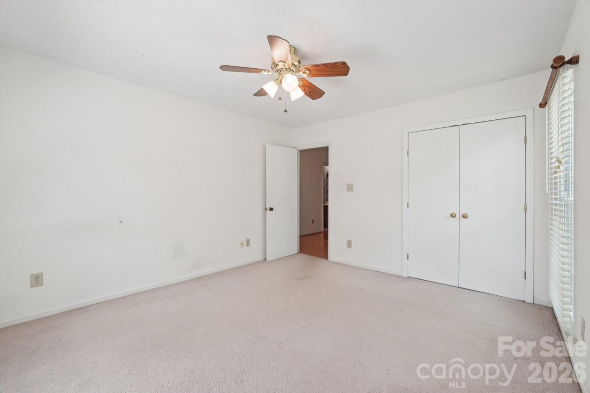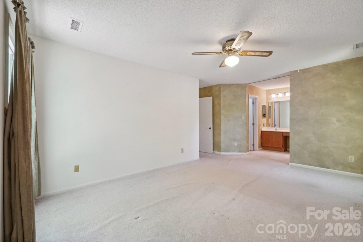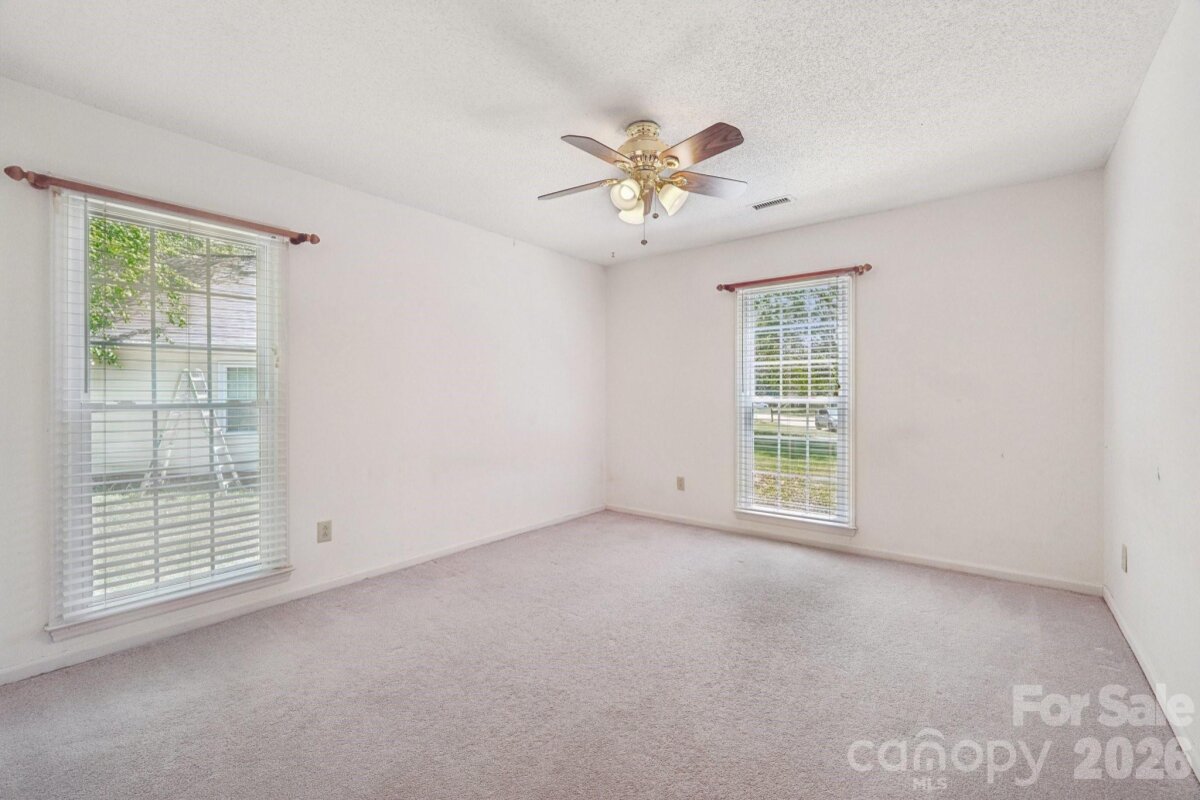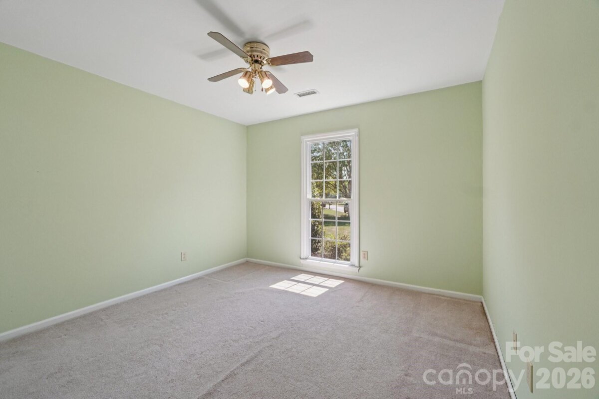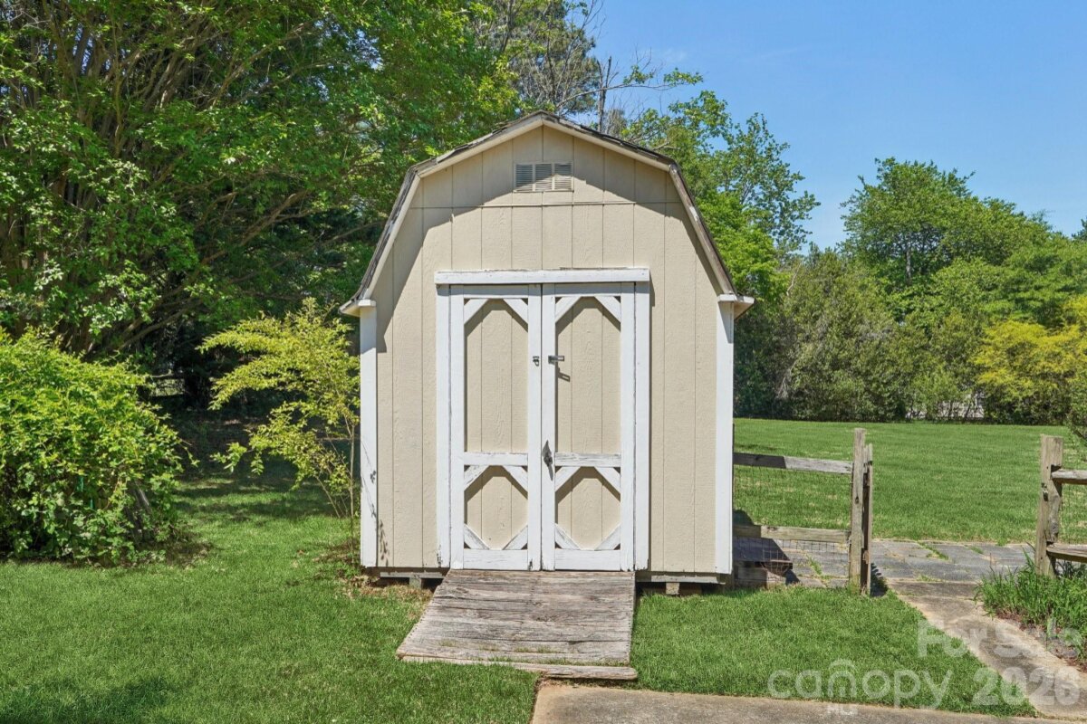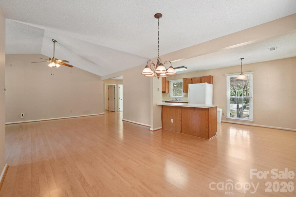 Tucked away on a quiet cul-de-sac in the desirable Raeburn community, this single-level ranch sits on a beautiful, level lot of approximately half an acre and offers a comfortable, functional layout with four bedrooms and inviting living spaces. A massive backyard - partially fenced - provides plenty of room to relax, garden, or entertain, and is complemented by both an outdoor storage shed and attached storage for added convenience. Inside, the home is designed for easy everyday living. The vaulted ceiling in the great room creates an airy feel, while a classic brick wood-burning fireplace with a wood mantle serves as a warm focal point. From here, a door leads directly to the patio, extending your living space outdoors. The eat-in kitchen features laminate countertops, a gas range, built-in microwave, and dishwasher, and flows seamlessly into a cozy breakfast nook as well as a separate dining area that can easily accommodate traditional or bench-style seating. A bright front bedroom with large windows and a ceiling fan offers flexibility as a guest room or home office. All bedrooms include ceiling fans for added comfort. A full hall bath serves the secondary bedrooms, while the primary suite offers a private retreat with a walk-in closet, vanity area, and full bath. Recent updates include a new roof (2025), water heater (2026), and a full vinyl exterior for low-maintenance living. A utility room adds everyday practicality, and the washer, dryer, and refrigerator will remain, making move-in even easier. The wood-burning fireplace has not been used by the current homeowner and is being sold as-is. This home presents a wonderful opportunity for updates and personalization, offering strong value in a prime location. Residents of Raeburn enjoy community amenities including a pool, tennis and pickleball courts, recreation field, and playground. Conveniently located near shopping, dining, fitness, and recreation in Blakeney, Waverly, Stonecrest, and Ballantyne, with easy access to I-485, this home blends comfort, potential, and an unbeatable setting.