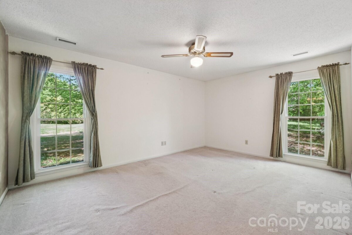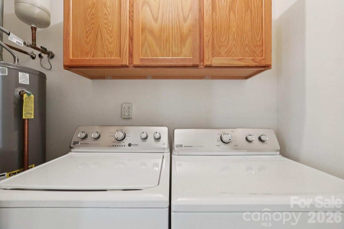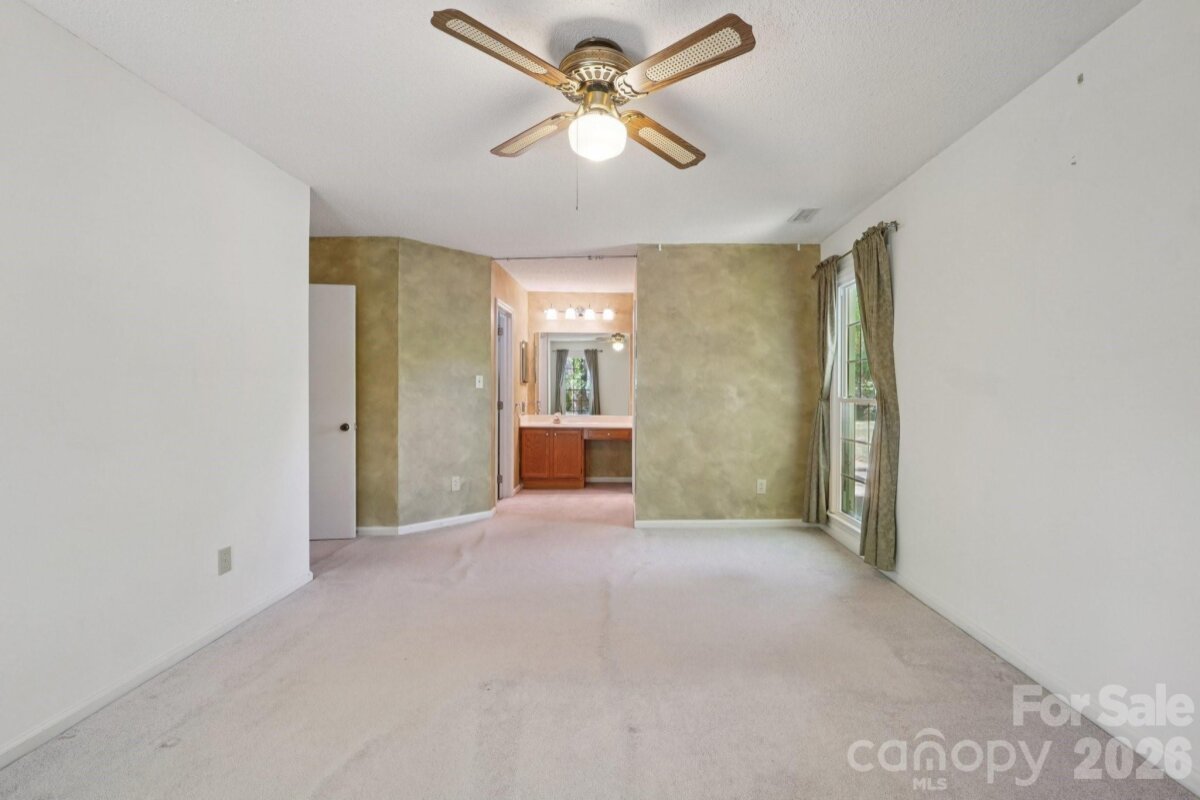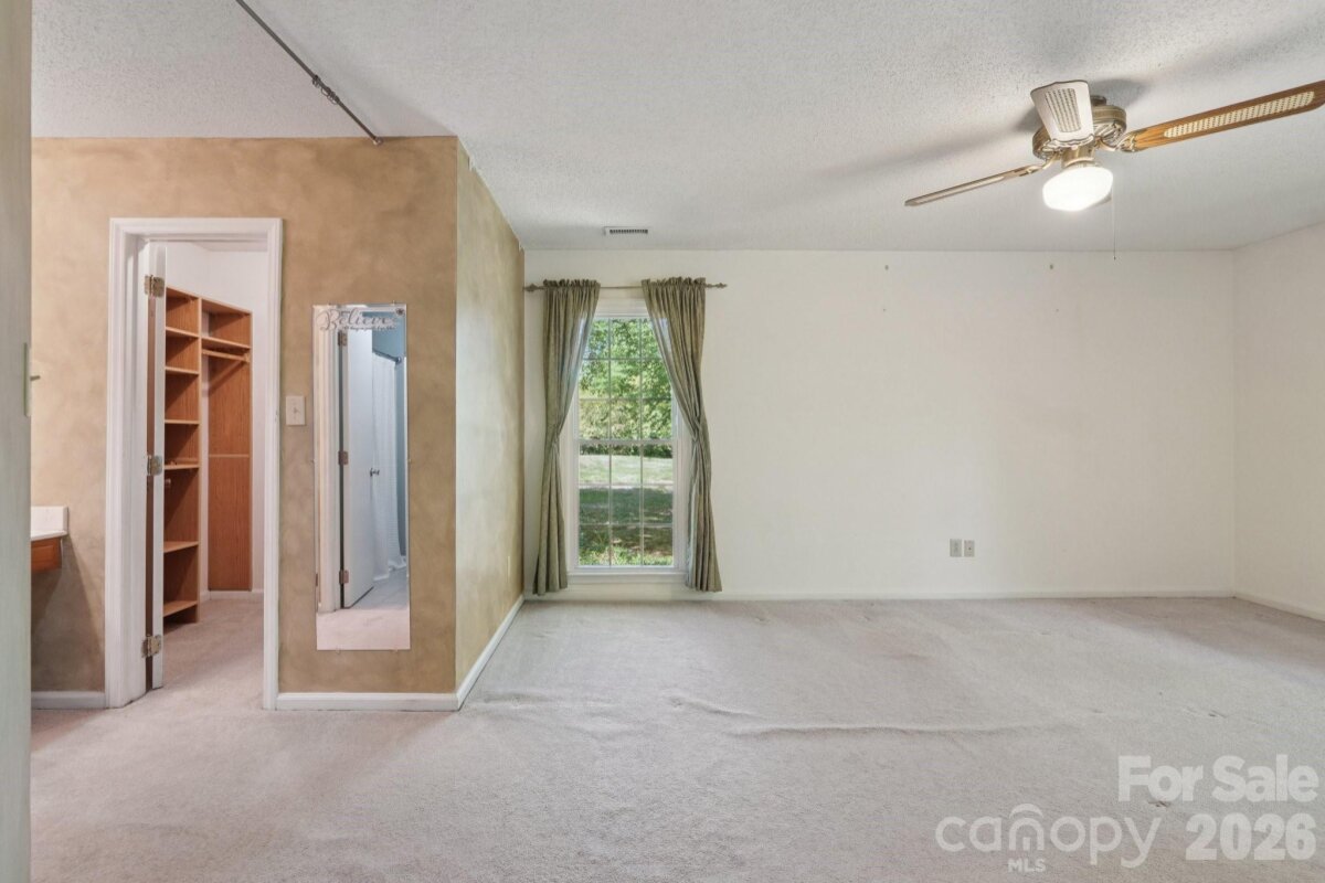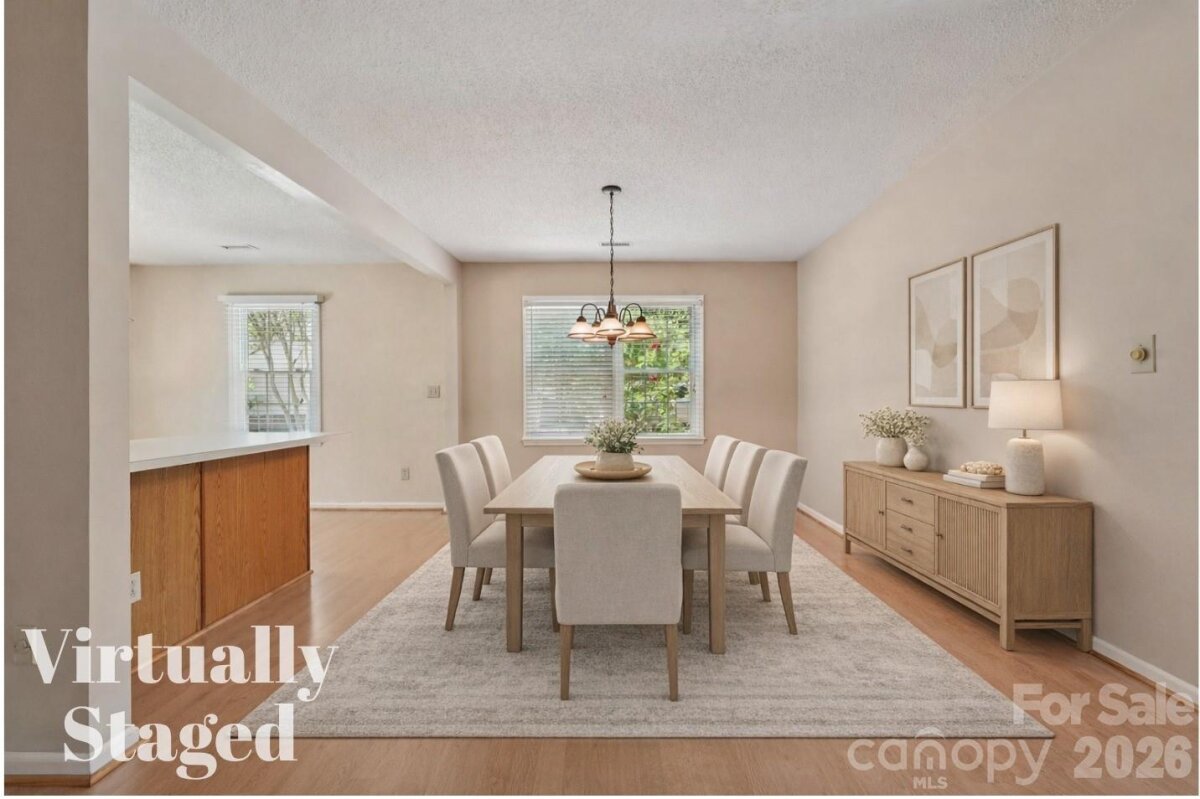 Tucked away on a quiet cul-de-sac in the desirable Raeburn community, this single-level ranch sits on a beautiful, level lot of approximately half an acre and offers a comfortable, functional layout with four bedrooms and inviting living spaces. A massive backyard - partially fenced - provides plenty of room to relax, garden, or entertain, and is complemented by both an outdoor storage shed and attached storage for added convenience. Inside, the home is designed for easy everyday living. The vaulted ceiling in the great room creates an airy feel, while a classic brick wood-burning fireplace with a wood mantle serves as a warm focal point. From here, a door leads directly to the patio, extending your living space outdoors. The eat-in kitchen features laminate countertops, a gas range, built-in microwave, and dishwasher, and flows seamlessly into a cozy breakfast nook as well as a separate dining area that can easily accommodate traditional or bench-style seating. A bright front bedroom with large windows and a ceiling fan offers flexibility as a guest room or home office. All bedrooms include ceiling fans for added comfort. A full hall bath serves the secondary bedrooms, while the primary suite offers a private retreat with a walk-in closet, vanity area, and full bath. Recent updates include a new roof (2025), water heater (2026), and a full vinyl exterior for low-maintenance living. A utility room adds everyday practicality, and the washer, dryer, and refrigerator will remain, making move-in even easier. The wood-burning fireplace has not been used by the current homeowner and is being sold as-is. This home presents a wonderful opportunity for updates and personalization, offering strong value in a prime location. Residents of Raeburn enjoy community amenities including a pool, tennis and pickleball courts, recreation field, and playground. Conveniently located near shopping, dining, fitness, and recreation in Blakeney, Waverly, Stonecrest, and Ballantyne, with easy access to I-485, this home blends comfort, potential, and an unbeatable setting.