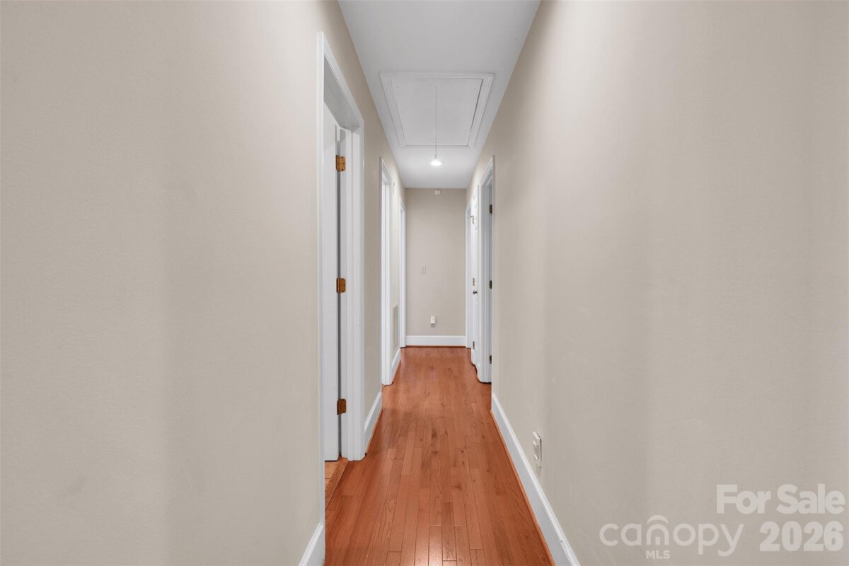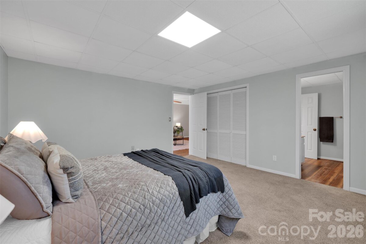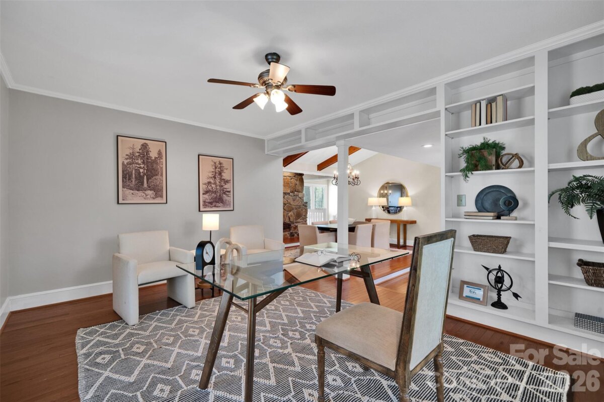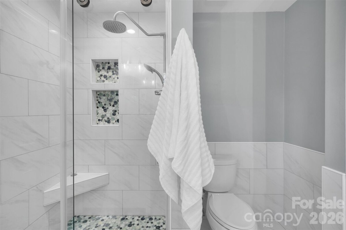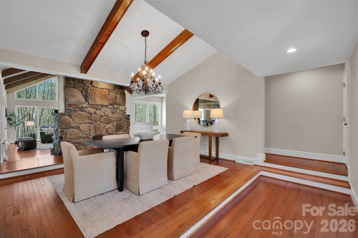 Tucked among mature trees on over an acre, this home impresses from the moment you arrive. The craftsman-inspired exterior sets the tone for the 3,073 square feet of living space inside. The main level features a flex room perfect as a formal living room or office, a formal dining room with vaulted and beamed ceiling, and kitchen with center island, pantry, stainless steel appliances, and granite countertops. The family room stuns with soaring cathedral ceiling, exposed wood beams, floor-to-ceiling windows overlooking the wooded lot, and a commanding stone fireplace. The main-level primary suite offers a private balcony overlooking the treed backyard and a spa-like updated bath with dual vanities, marble countertops, and a walk-in shower. Two additional bedrooms and a bright secondary bath with skylight complete the upper level. The lower level delivers a sprawling rec room with wet bar, dedicated office with closet, en-suite bathroom, (septic is permitted for 3 bedrooms) slider to the outdoors, and abundant natural light. Ideal as a second living area, in-law suite, or entertainment hub. Out back, a charming creek winds along the rear of the property, creating a rare natural retreat. The unfinished workshop accessed from the backyard rounds out this one-of-a-kind property. Zoned for top-rated schools and minutes from I-485, Waverly, and all the dining and shopping Matthews has to offer and minutes to outdoor recreation at Colonel Francis J Beatty Park and Squirrel Lake Park. Rare acreage, top rated schools, incredible flexibility, and an unbeatable location - this one is truly special.