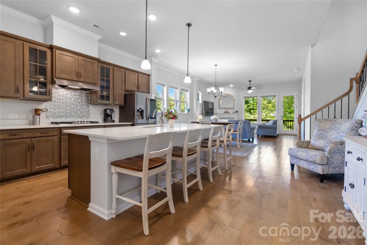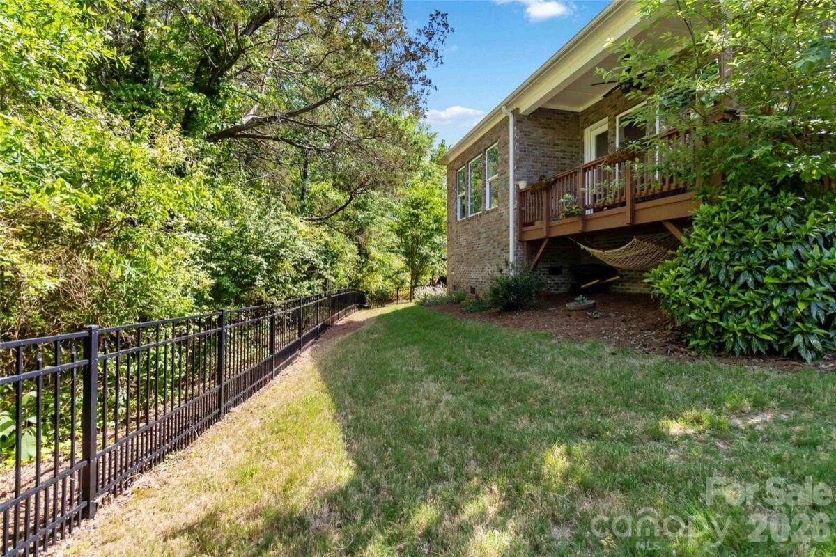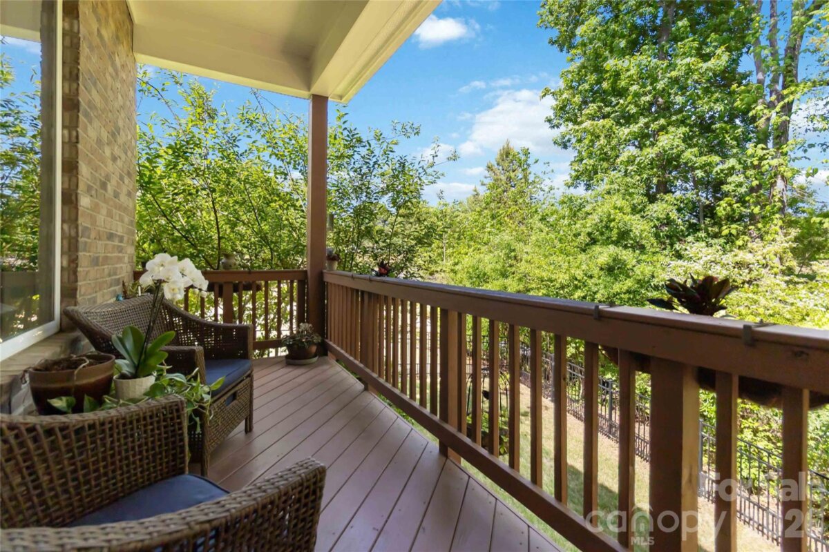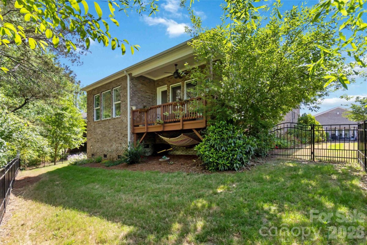 Welcome to this beautifully crafted brick home, ideally situated on a rare, oversized lot in sought-after Eden Hall—just minutes from Downtown Matthews. Designed for both everyday living and entertaining, the open floor plan features 10’ ceilings, abundant natural light, and hardwood floors throughout the main living areas. A flexible front room provides the perfect space for a home office, music room, play room, or sitting area. The gourmet kitchen is the centerpiece of the home, offering quartz countertops, stainless steel appliances, gas cooktop, glass-front cabinetry, and a large island that flows seamlessly into the dining area and great room. The great room with gas fireplace opens to a balcony that overlooks the backyard trees. The oversized main-level primary suite delivers convenience and comfort, featuring a spa-inspired bath with a large tiled walk-in shower, transom window, and dual vanities. Large walk-in closet has direct access to the laundry room, complete with folding station. Upstairs, a spacious loft creates an ideal secondary living area, complemented by a private guest suite with ensuite bath plus an additional bedroom with access to a full bath with tiled walk-in shower. A large walk-in attic provides excellent storage or future expansion potential. Enjoy outdoor living from the covered rear balcony overlooking a fenced yard and wooded backdrop—offering both privacy and usable space rarely found in the neighborhood. HOA-maintained lawn care, landscaping, and irrigation allow for low-maintenance living in a prime location close to shopping, dining, and community amenities. Don't miss this opportunity - schedule your showing Today!