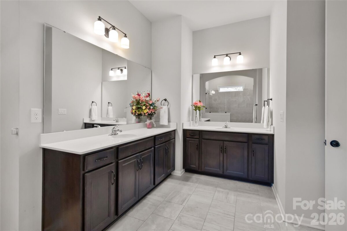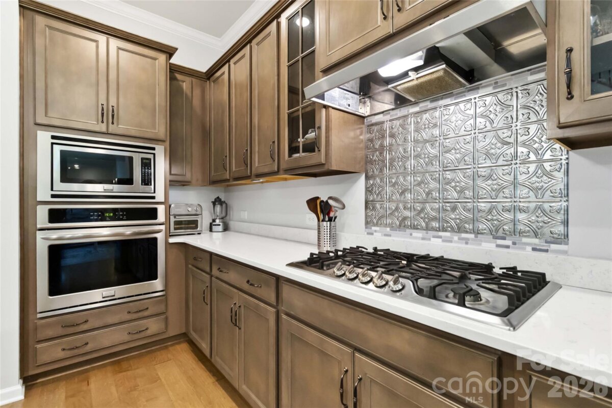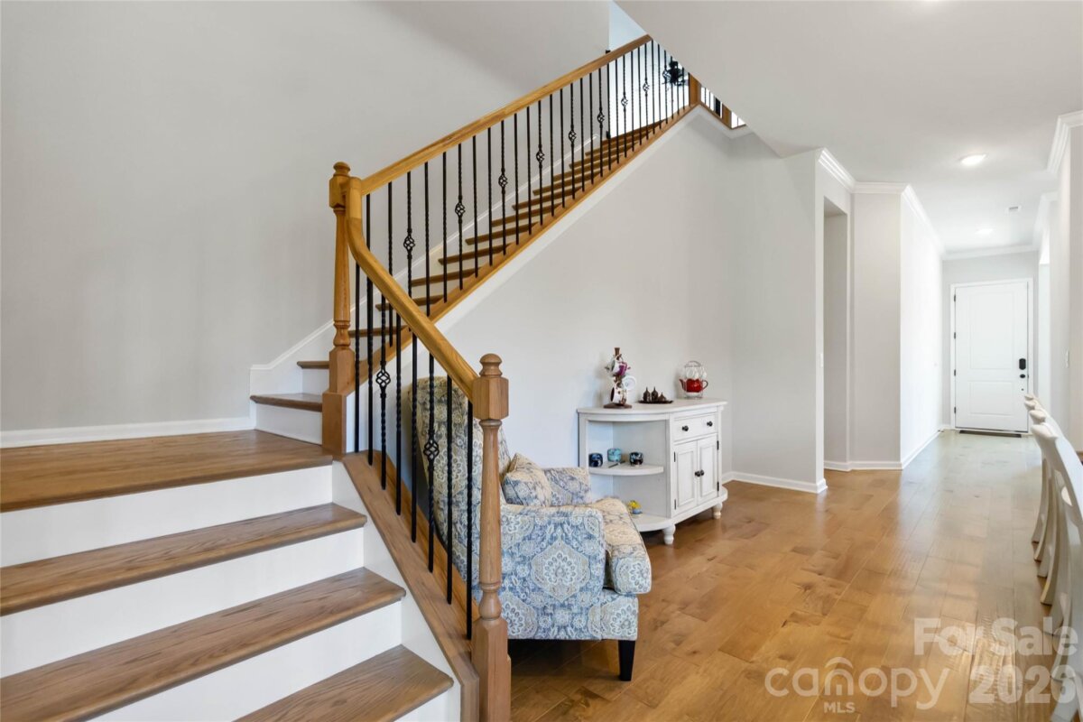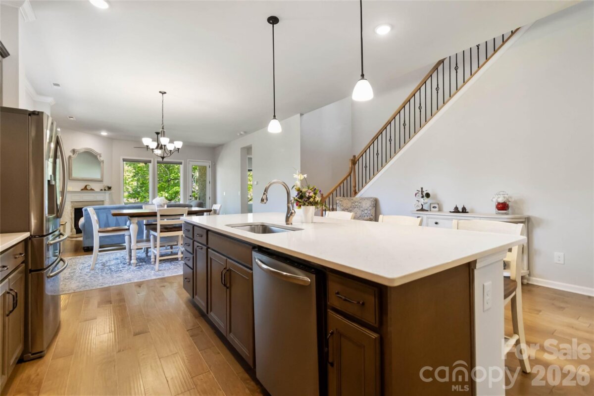 Welcome to this beautifully crafted brick home, ideally situated on a rare, oversized lot in sought-after Eden Hall—just minutes from Downtown Matthews. Designed for both everyday living and entertaining, the open floor plan features 10’ ceilings, abundant natural light, and hardwood floors throughout the main living areas. A flexible front room provides the perfect space for a home office, music room, play room, or sitting area. The gourmet kitchen is the centerpiece of the home, offering quartz countertops, stainless steel appliances, gas cooktop, glass-front cabinetry, and a large island that flows seamlessly into the dining area and great room. The great room with gas fireplace opens to a balcony that overlooks the backyard trees. The oversized main-level primary suite delivers convenience and comfort, featuring a spa-inspired bath with a large tiled walk-in shower, transom window, and dual vanities. Large walk-in closet has direct access to the laundry room, complete with folding station. Upstairs, a spacious loft creates an ideal secondary living area, complemented by a private guest suite with ensuite bath plus an additional bedroom with access to a full bath with tiled walk-in shower. A large walk-in attic provides excellent storage or future expansion potential. Enjoy outdoor living from the covered rear balcony overlooking a fenced yard and wooded backdrop—offering both privacy and usable space rarely found in the neighborhood. HOA-maintained lawn care, landscaping, and irrigation allow for low-maintenance living in a prime location close to shopping, dining, and community amenities. Don't miss this opportunity - schedule your showing Today!