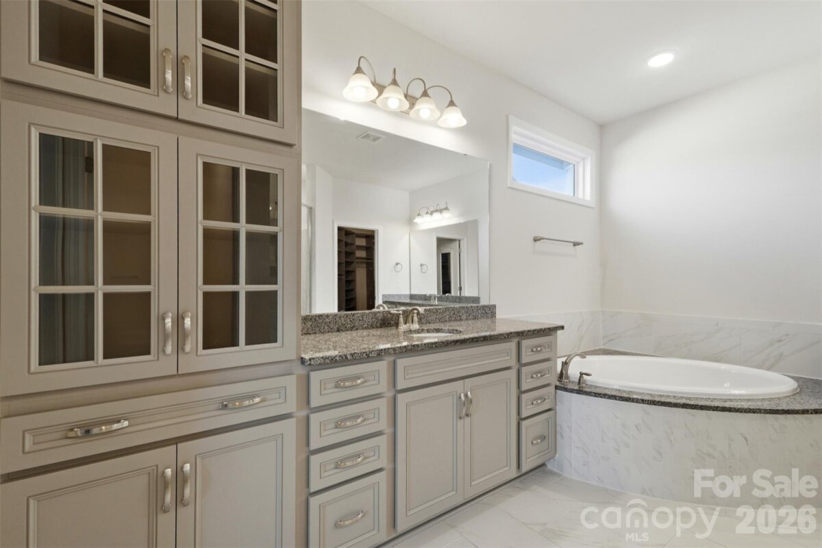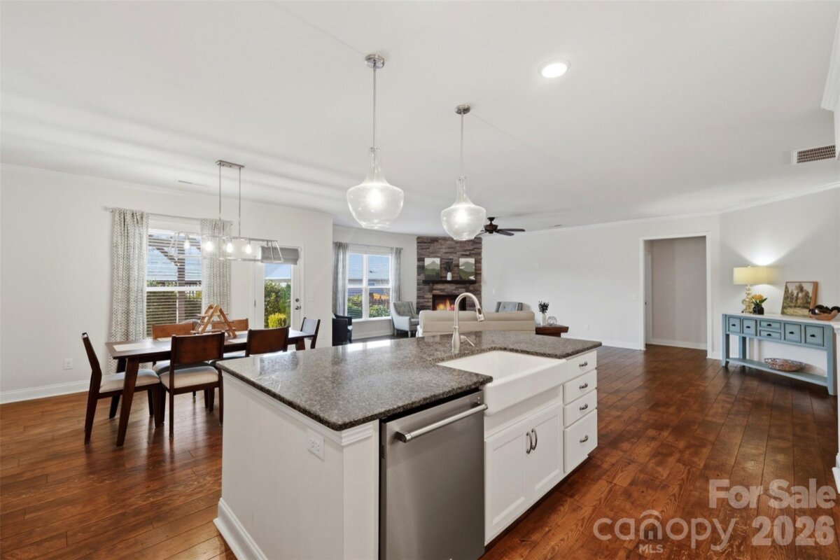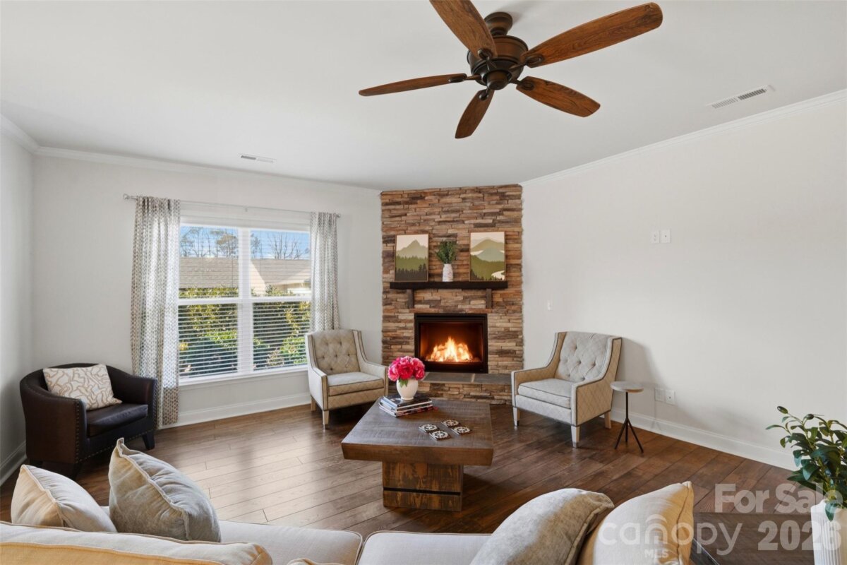 Discover effortless one-level living in the highly sought-after Tilley Manor community in Matthews, NC. Built in 2017 and meticulously maintained, this home shows like new and offers the ideal blend of modern finishes, functional design, and serene outdoor living. The open-concept floor plan is perfect for entertaining and everyday living, anchored by a gourmet kitchen featuring granite countertops, a gas cooktop, stainless steel appliances, and ample cabinetry—ideal for both casual meals and elevated entertaining. Just off the kitchen, a built-in office nook provides the perfect work-from-home setup. Unwind in the inviting living area with a gorgeous stone gas fireplace, adding warmth and charm during cooler months. Step outside to your private patio with pergola and professionally landscaped surroundings, where mornings begin with coffee and birdsong and evenings end in total relaxation. The spacious primary suite impresses with a tray ceiling, custom walk-in closet, and a spa-like primary bathroom complete with dual vanities, a soaking tub, and a large walk-in shower. The secondary bathroom has also been thoughtfully renovated, adding value and modern appeal for guests or additional household members. Additional highlights include irrigation for easy lawn care, abundant storage, and true move-in-ready condition. Located minutes from shopping, dining, and everyday conveniences, and zoned for award-winning McKee Elementary, Jay M. Robinson Middle School, and Providence High School, this home offers the best of Matthews living with comfort, style, and location all in one. Welcome home to 5306 Tilley Manor Drive—where low-maintenance luxury meets everyday ease.